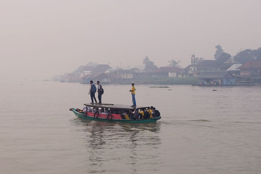 Pupils ride boat across Musi River under a blanket of smoke in Palembang, South Sumatra, Indonesia, Sept. 17, 2019. (Xinhua/Muhammad Fadjrie)