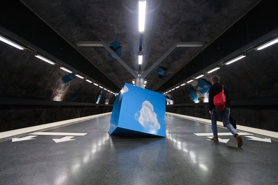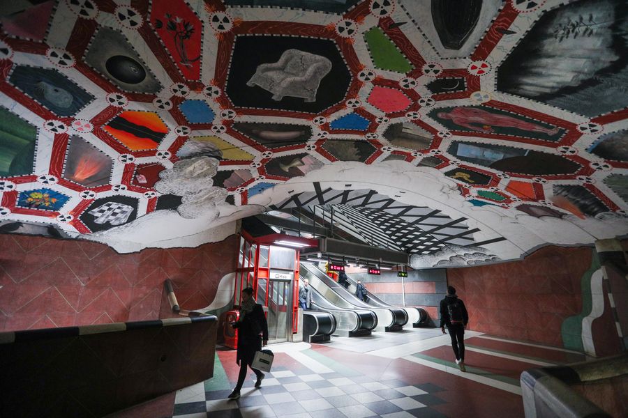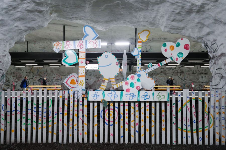 An art installation is seen in Hallonbergen metro station in Stockholm, Sweden, Oct. 8, 2019. (Xinhua/Zheng Huansong)