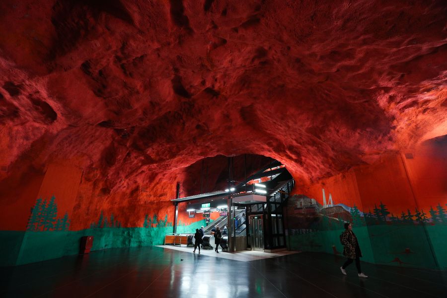 Passengers walk in the Tekniska Hogskolan metro station in Stockholm, Sweden, Oct. 9, 2019. (Xinhua/Zheng Huansong)