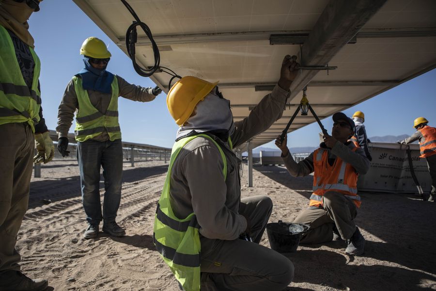 Workers install solar panels at a photovoltaic plant in the town of Cafayate, Salta Province, Argentina, Sept. 18, 2019. (Xinhua/Martin Zabala)