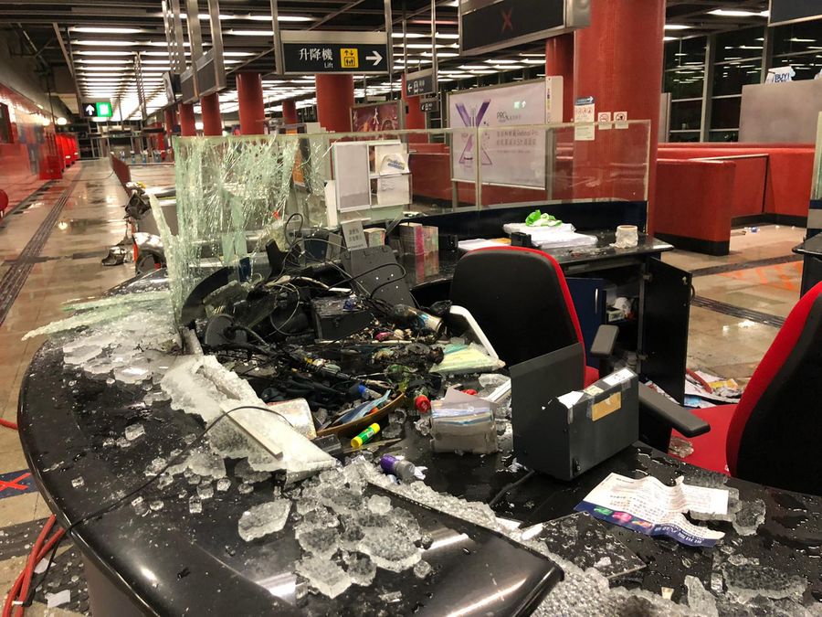 Photo shows an info counter at a MTR station smashed by rioters in south China's Hong Kong. (Photo courtesy of MTR)