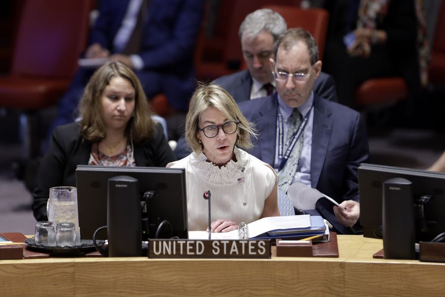 Kelly Craft (front) , U.S. permanent representative to the United Nations, addresses a Security Council meeting on the situation in Yemen, at the UN headquarters in New York, Sept. 16, 2019. (Xinhua/Li Muzi)