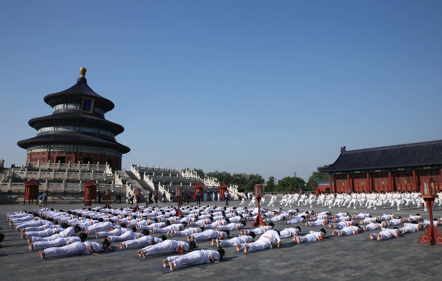 People practise Yoga during a Taichi and Yoga show at the Temple of Heaven in Beijing, capital of China, May 15, 2015. (Xinhua/Pang Xinglei)