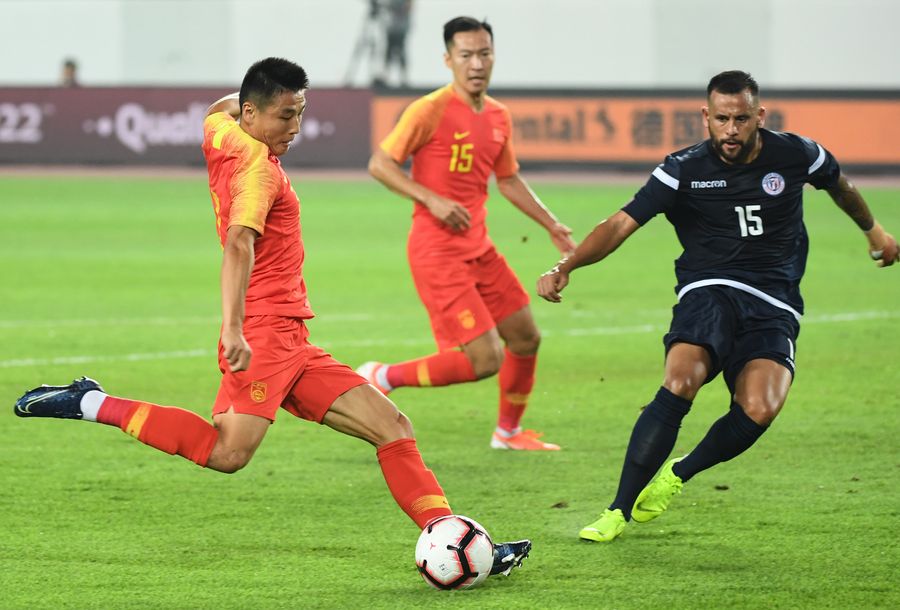 Wu Lei (L) of China shoots during the group A match between China and Guam at the FIFA World Cup Qatar 2022 and AFC Asian Cup China 2023 Preliminary Joint Qualification Round 2 in Guangzhou, capital of south China's Guangdong Province, Oct. 10, 2019. (Xinhua/Deng Hua)