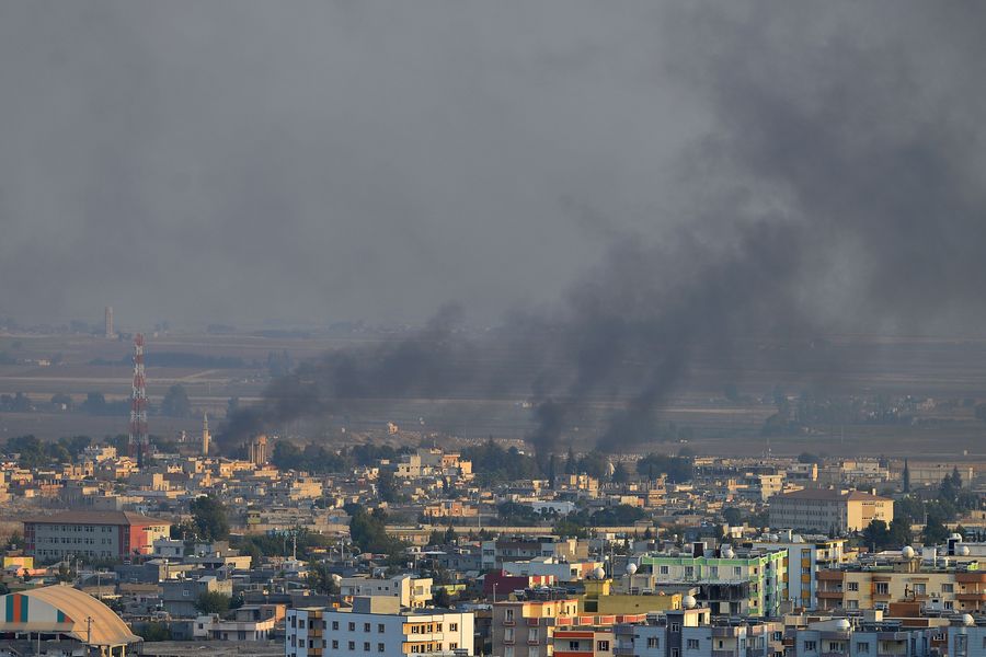 Photo taken from southern Turkish border town of Ceylanpinar on Oct. 10, 2019 shows smoke rising from the northern Syrian city of Ras al-Ain during an attack launched by Turkish army. (Xinhua/Mustafa Kaya)