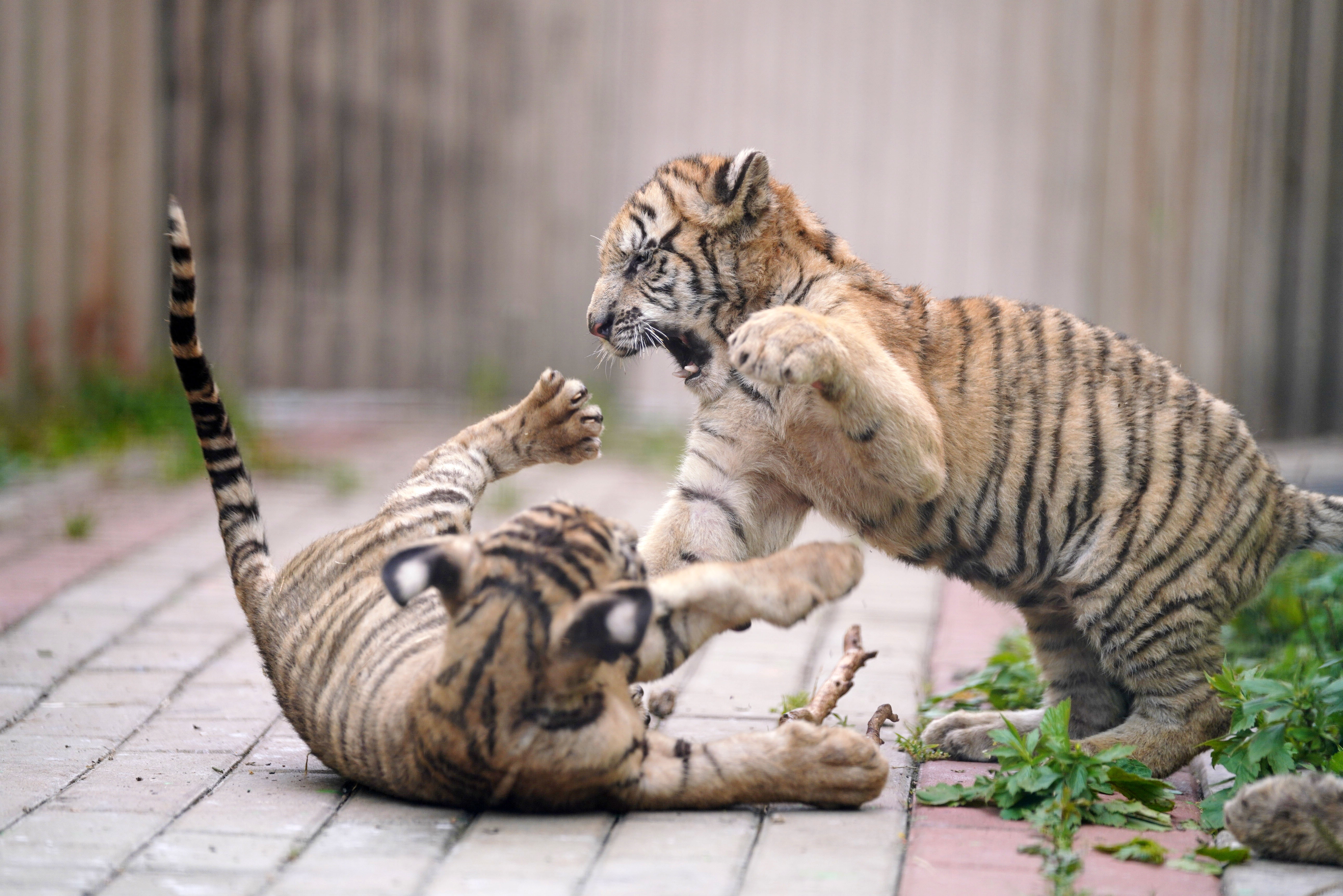File photo taken on July 12, 2019 shows Siberian tiger cubs playing at the Siberian tiger park of the China Hengdaohezi Feline Breeding Center in Hailin, northeast China's Heilongjiang Province. (Xinhua/Wang Jianwei)