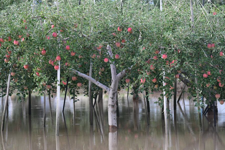 Apple trees are flooded after the bank of the Chikuma River collapsed in Nagano Prefecture, Japan, Oct. 13, 2019. (Xinhua/Hua Yi)