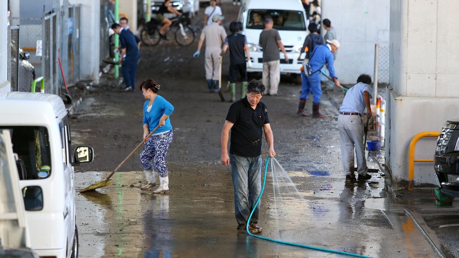 Residents clear the road after the flood in Tokyo, Japan, Oct. 13, 2019. (Xinhua/Ma Caoran)