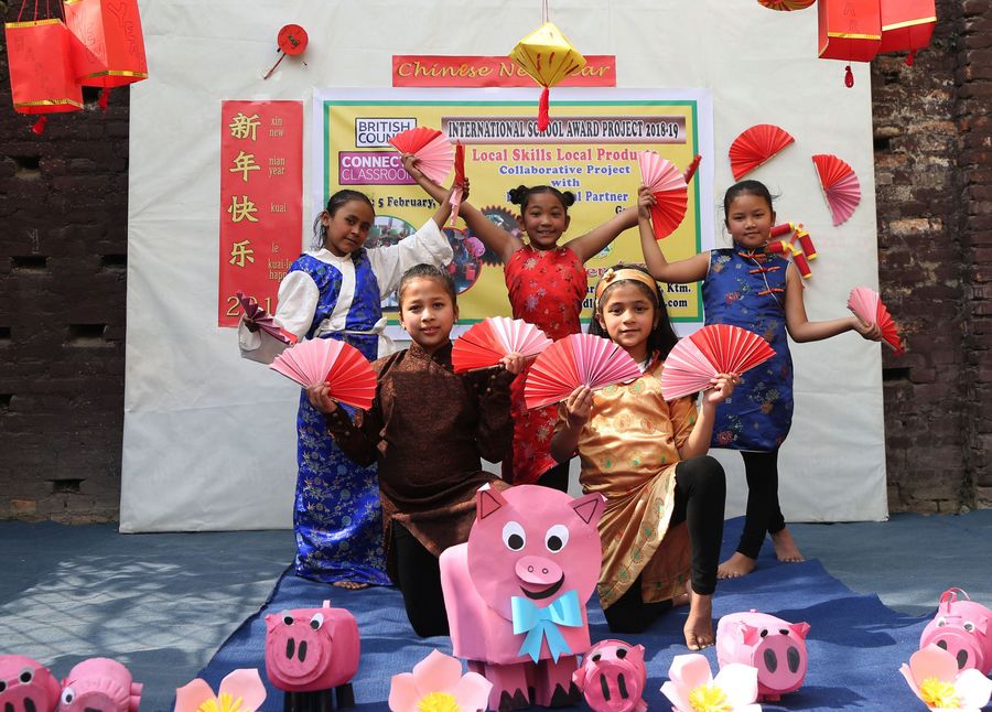 Nepalese students perform a Chinese dance during celebrations of the Chinese Lunar New Year at a local school in Kathmandu, Nepal, Feb. 6, 2019. (Xinhua/Sunil Sharma)