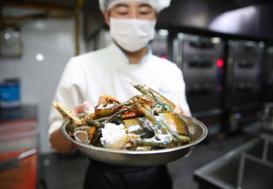 A chef shows American lobsters at one of the Freshhema supermarkets in Shanghai, east China, Aug. 8, 2018. (Xinhua/Ding Ting)