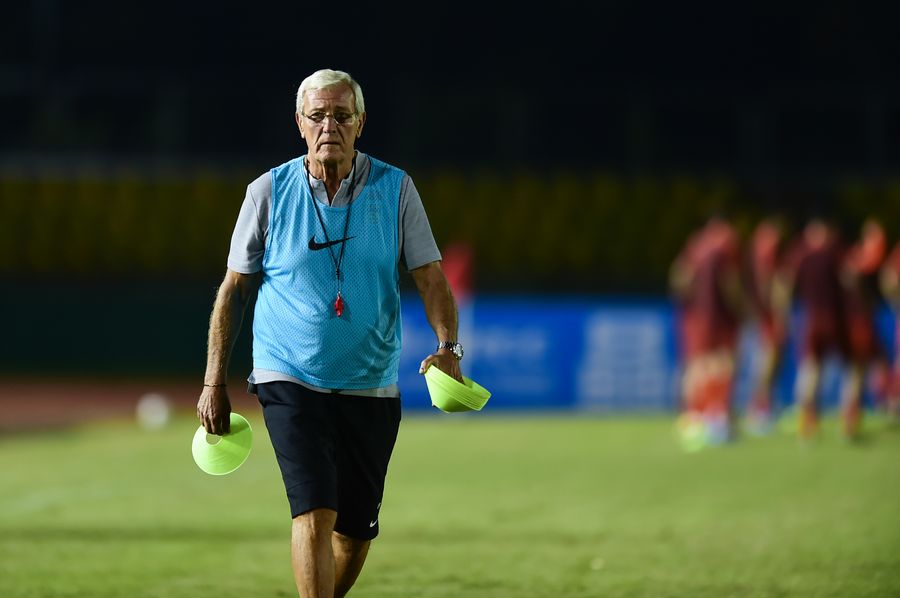 Head coach Marcello Lippi walks accross the pitch during China's pre-game training session for the World Cup Asian qualifier against the Philippines in Bacolod on Oct. 14. (Xinhua/Du Yu)