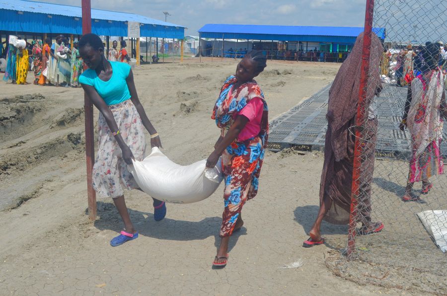 People carry food rations donated by the World Food Program (WFP) at the Malakal Protection of Civilians site in Malakal, South Sudan, June 19, 2019. (Photo by Denis Elamu/Xinhua)