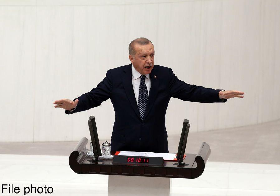 Turkish President Recep Tayyip Erdogan speaks at the opening ceremony of the new legislative year of the Turkish parliament in Ankara, Turkey, on Oct. 1, 2019. (Photo by Mustafa Kaya/Xinhua)