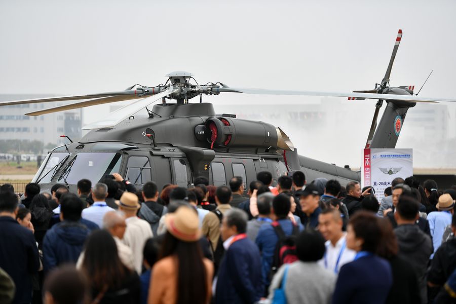 People look at a Zhi-20 (Z-20) helicopter during the 5th China Helicopter Exposition in north China's Tianjin, Oct. 10, 2019. A fleet of China's new self-developed Z-20 helicopters has made a demonstration flight at the ongoing helicopter expo in the city of Tianjin. (Xinhua/Li Ran)
