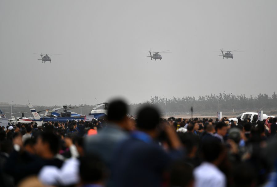 Three Zhi-20 (Z-20) helicopters participate in a demo flight during the 5th China Helicopter Exposition in north China's Tianjin, Oct. 10, 2019. A fleet of China's new self-developed Z-20 helicopters has made a demonstration flight at the ongoing helicopter expo in the city of Tianjin. (Xinhua/Li Ran)
