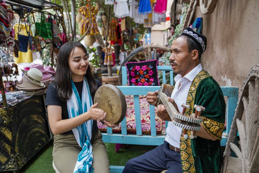 Local residents who are involved in the tourism business play music for tourists in the old town of Kashgar, northwest China's Xinjiang Uygur Autonomous Region, July 9, 2019. A growing number of local residents are making money from the current tourism boom in Xinjiang. (Xinhua/Zhao Ge)