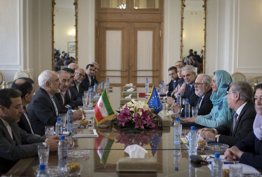 Iran's Foreign Minister Mohammad Javad Zarif (3rd L) meets with visiting EU foreign policy chief Federica Mogherini in Tehran, Iran, on April 16, 2016. (Xinhua/Ahmad Halabisaz)