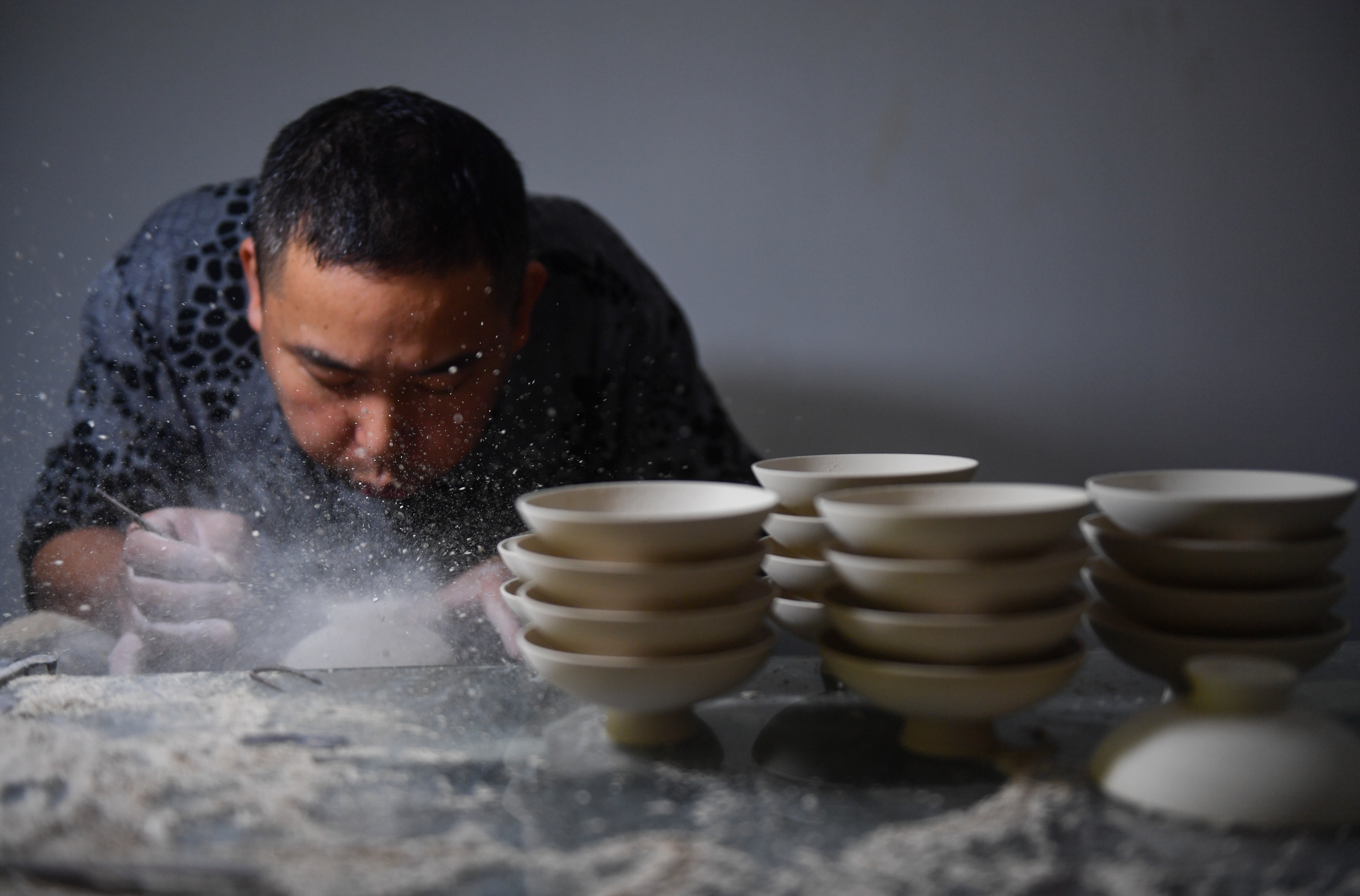 A member of the team "Kuaixueshiqing" polishes an unburnt porcelain work in Jingdezhen, east China's Jiangxi Province, Oct. 15, 2019. Wang Minhui, 40, is dedicated to making egg shell porcelain, a renowned kind of traditional porcelain work produced in Jingdezhen of Jiangxi and famous for thin and transparent body. He leads the "Kuaixueshiqing" team with over 20 members and has made in 2013 an egg shell porcelain bowl decorated with the famous Chinese painting "Along the River During the Qingming Festival", which boasts of a thickness of less than one millimeter and was painted all in reversed direction.