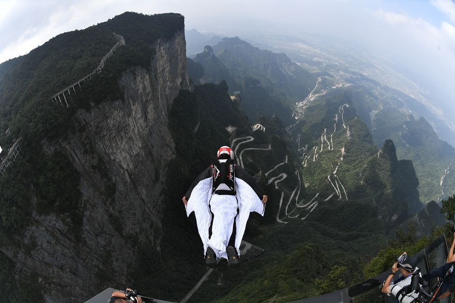 An Italian wingsuit athlete competes at the Tianmen Mountain scenic spot in Zhangjiajie, central China's Hunan Province, Sept. 4, 2019. (Photo by Shao Ying/Xinhua)