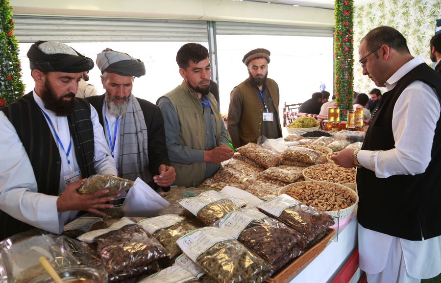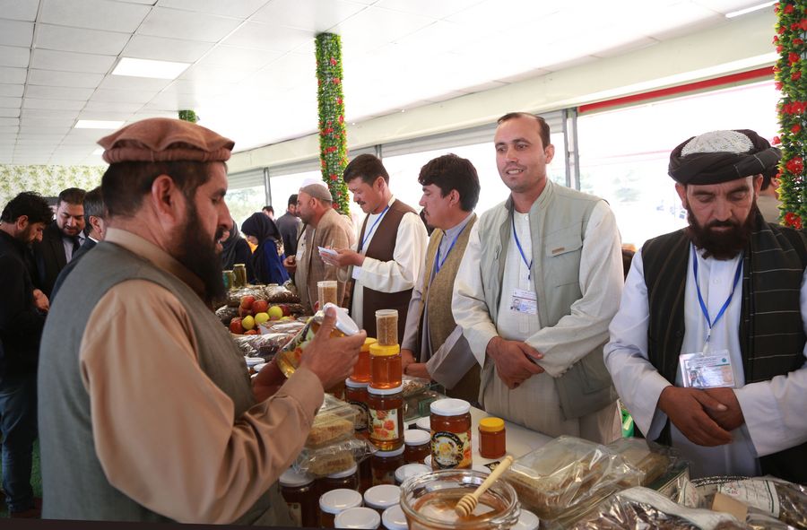 Agricultural products are displayed in the kiosks at the Agricultural Fair in Kabul, capital of Afghanistan, Oct. 16, 2019. (Xinhua/Rahmatullah Alizadah)