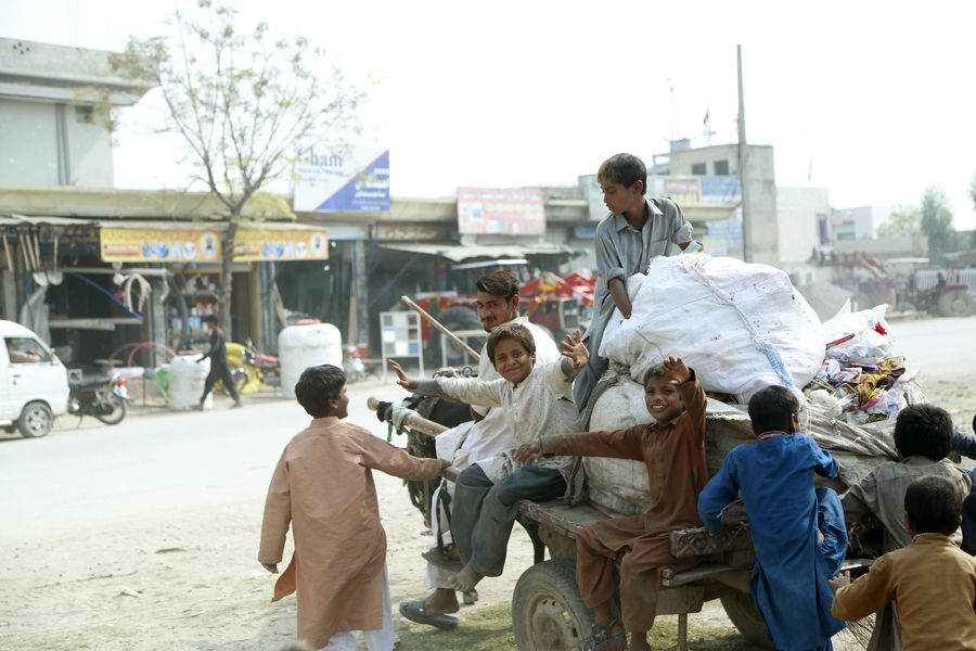 Children ride on a donkey cart at a slum on the outskirts of Rawalpindi, Pakistan, on Oct. 17, 2019, the 27th International Day for the Eradication of Poverty. (Photo by Ahmad Kamal/Xinhua)