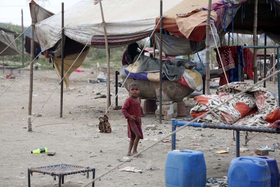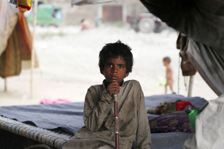 A boy sits in a makeshift tent in a slum on the outskirts of Rawalpindi, Pakistan, Oct. 17, 2019. Oct. 17, (Photo by Ahmad Kamal/Xinhua)