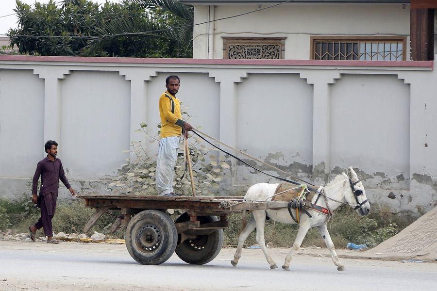A man rides a donkey-drawn cart on the outskirts of Rawalpindi, Pakistan, Oct. 17, 2019. (Photo by Ahmad Kamal/Xinhua)