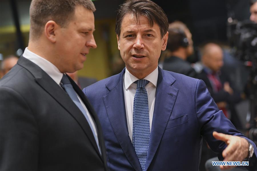 Italian Prime Minister Giuseppe Conte (R) talks with Estonian Prime Minister Juri Ratas at a round table meeting at the second day of the EU summit in Brussels, Belgium, Oct. 18, 2019. (Photo by Riccardo Pareggiani/Xinhua)