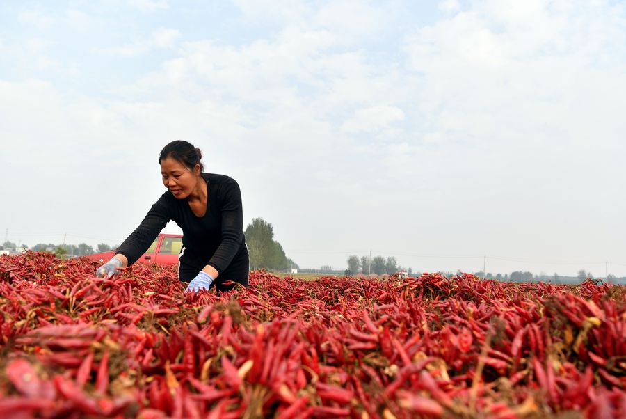 A farmer dries chili peppers in Zhouying Village, Naodian Township of Baofeng County, central China's Henan Province, on Oct. 16, 2019. (Xinhua/Li Jianan)