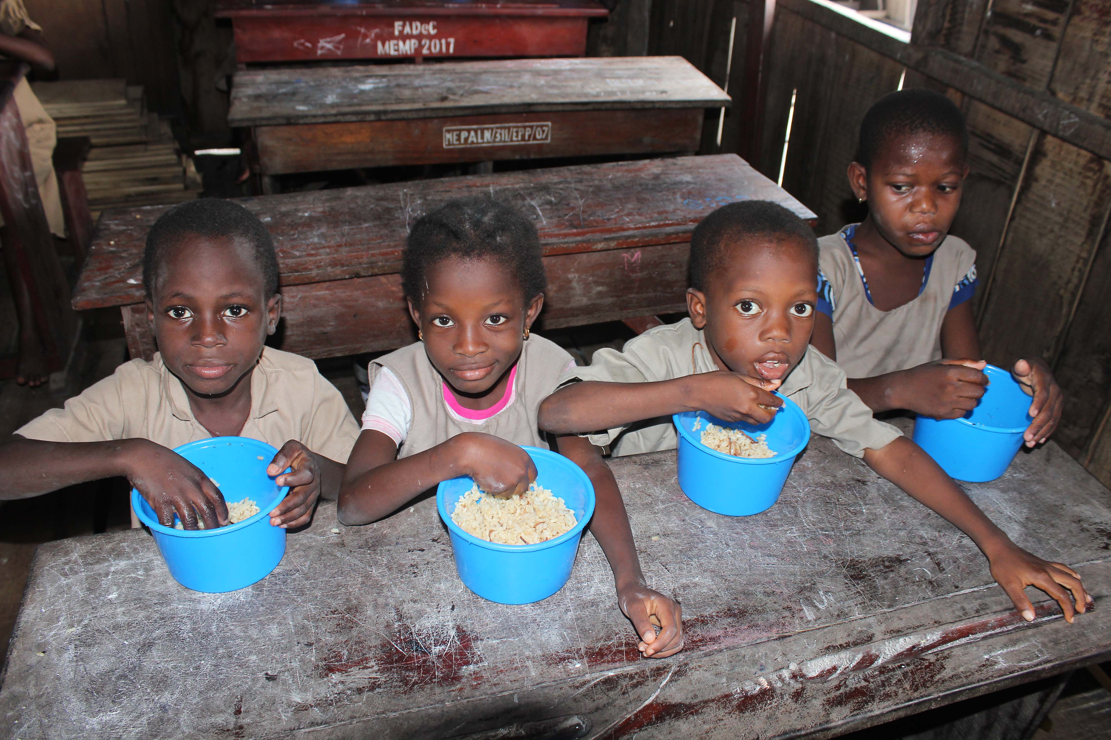 Students have China-aided rice for lunch at Toyoyome primary school at suburb of Cotonou, Benin, Oct. 17, 2019. Benin's Minister of State for Planning and Development Abdoulaye Bio-Tchane said China has been the main partner to the West African nation's integrated school feeding program aimed at improving school enrolment and retention rates for children. (Photo by Seraphin Zounyekpe/Xinhua)