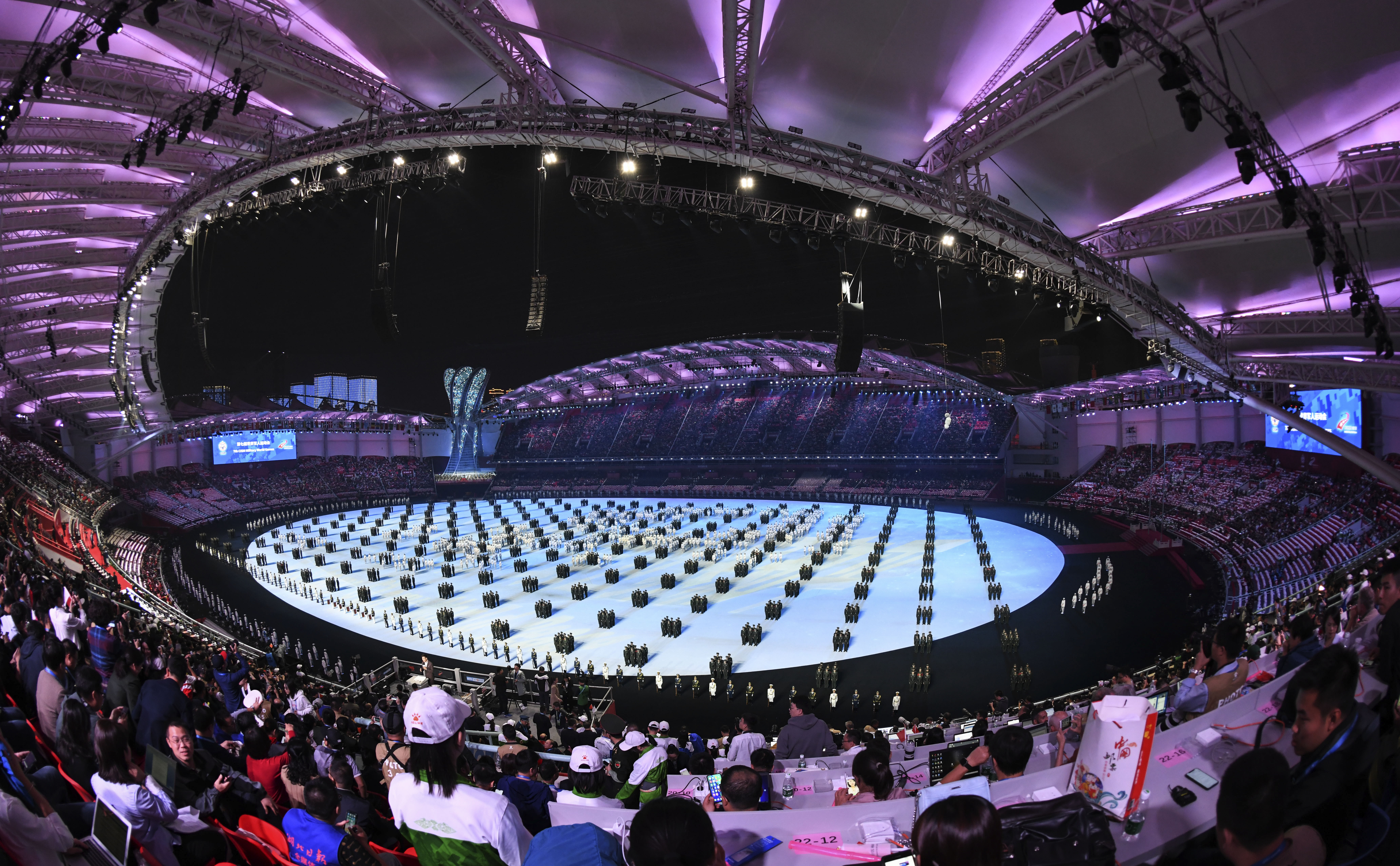 Photo taken on Oct. 18, 2019 shows a view of the opening ceremony of the 7th International Military Sports Council (CISM) Military World Games in Wuhan, capital of central China's Hubei Province. China launched the 2019 Military World Games in its inland metropolis of Wuhan Friday evening with a dazzling ceremony showcasing the nation's ancient civilization and an offer of friendship to the world. (Xinhua/Cheng Min)