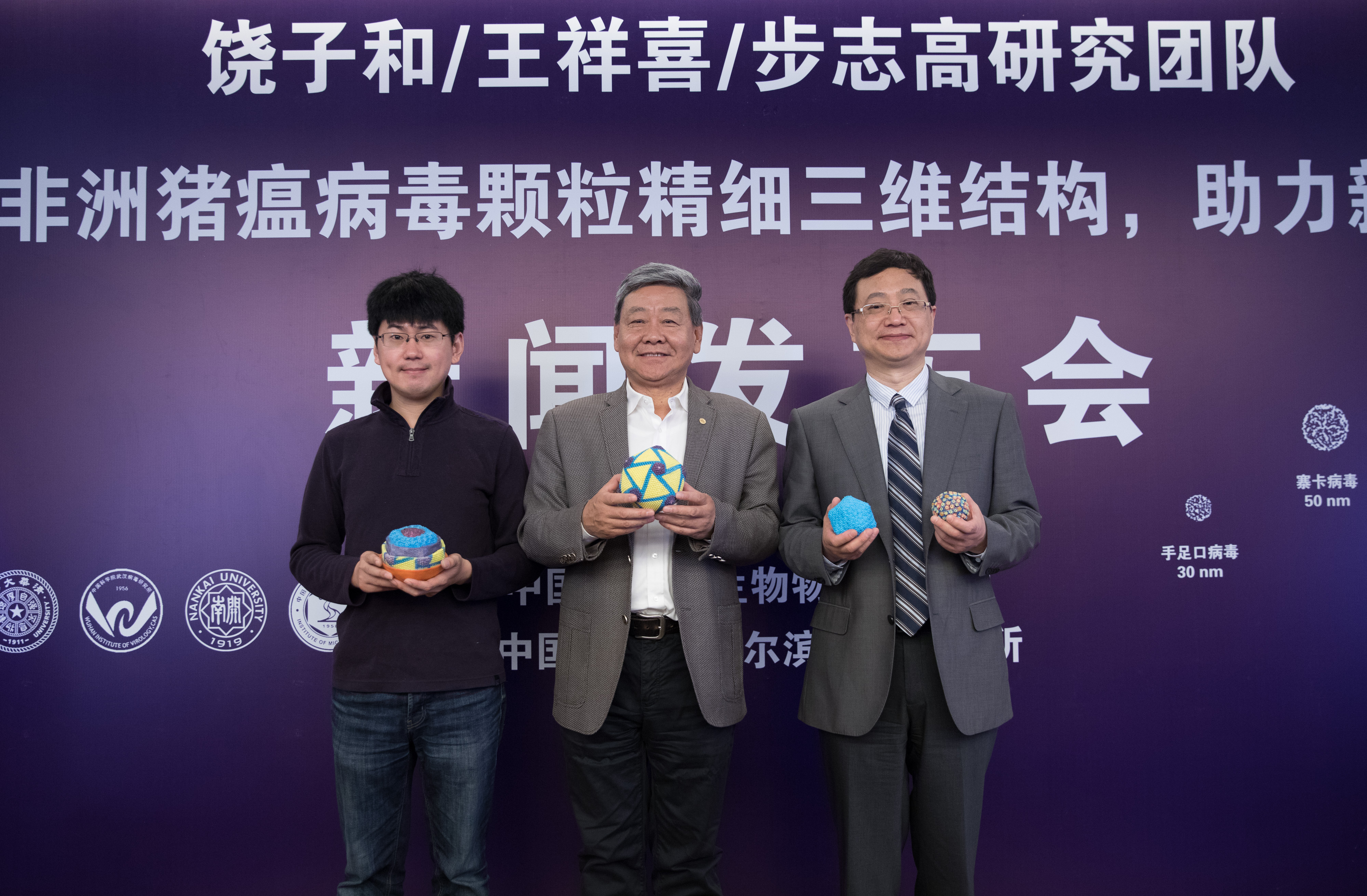 Rao Zihe (C), an academician with the Chinese Academy of Sciences (CAS), Wang Xiangxi (L), a researcher at the Institute of Biophysics of CAS, and Bu Zhigao (R), director of the Harbin Veterinary Research Institute of the Chinese Academy of Agricultural Sciences (CAAS), pose for photos at a press conference held by the Institute of Biophysics of CAS in Beijing, capital of China, Oct. 18, 2019. Chinese scientists have unraveled the three-dimensional structure of the African swine fever virus, laying a solid foundation for developing effective and safe vaccines against the disease.