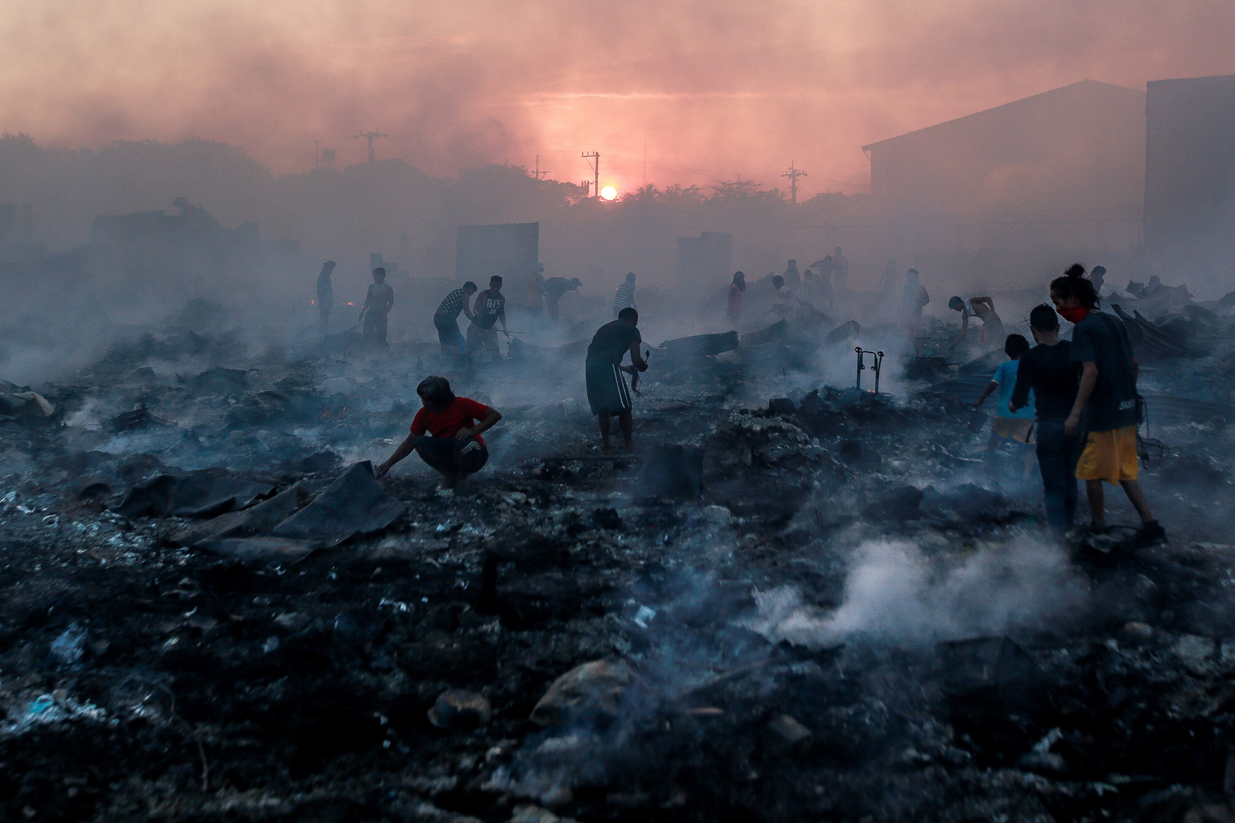 Residents look for their belongings through their charred homes after a fire at a residential area in Navotas City, the Philippines, Oct. 18, 2019. According to the Navotas City Disaster Risk Reduction Management Office, around 200 shanties were razed in the fire. (Xinhua/Rouelle Umali)