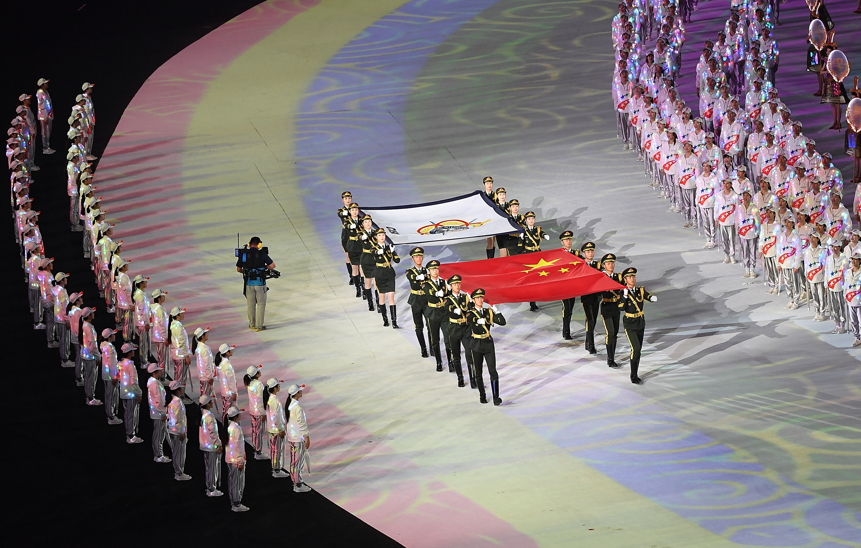 The national flag of the People's Republic of China and the flag of the International Military Sports Council (CISM) are carried into the stadium during the opening ceremony of the 7th CISM Military World Games in Wuhan, capital of central China's Hubei Province, Oct. 18, 2019. China launched the 2019 Military World Games in its inland metropolis of Wuhan Friday evening with a dazzling ceremony showcasing the nation's ancient civilization and an offer of friendship to the world. (Xinhua/Cheng Min)