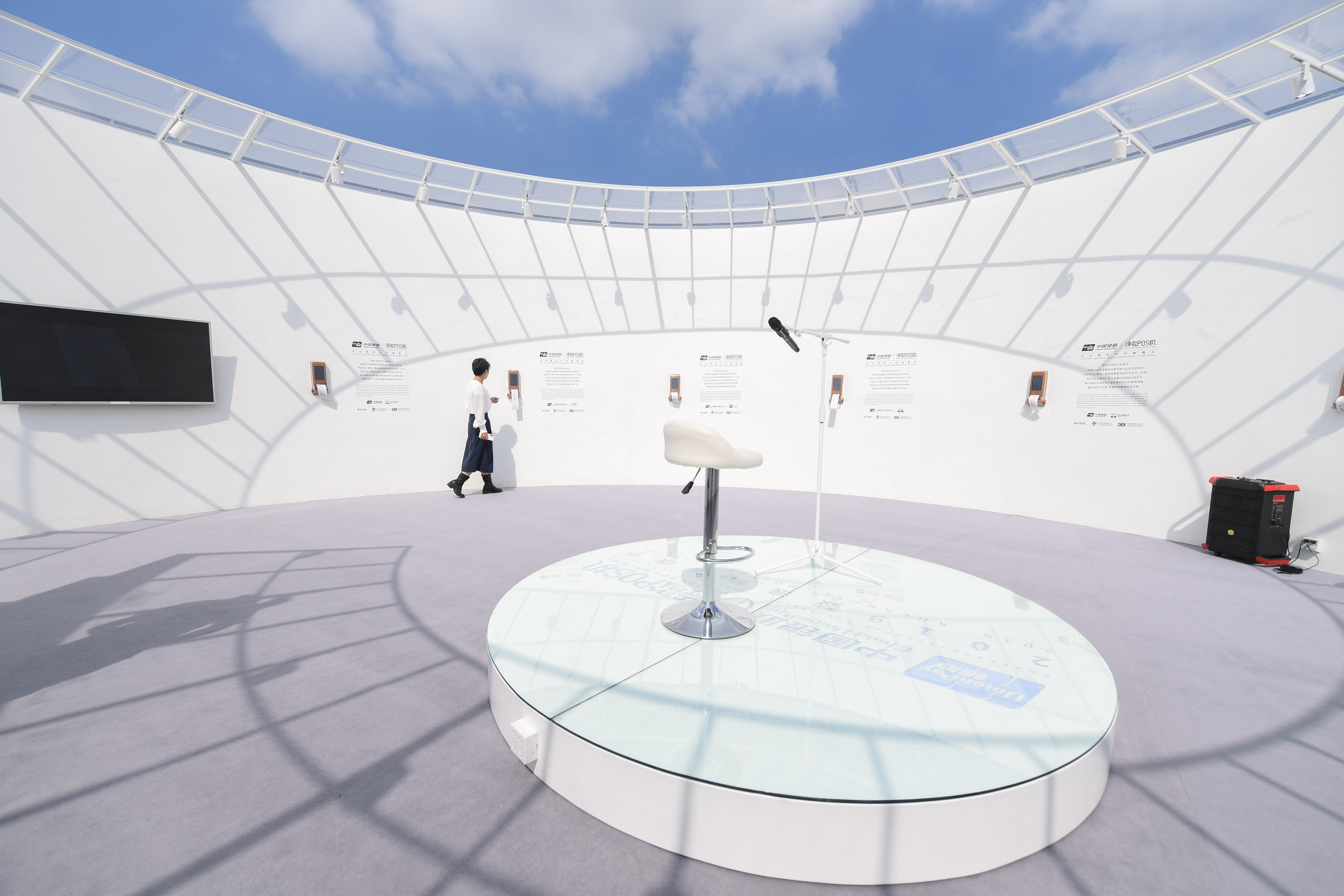 People visit the venue during an event of Gulangyu Poetry Festival in Gulangyu, Xiamen, southeast China's Fujian Province, Oct. 18, 2019. The three-day Gulangyu Poetry Festival kicked off on Friday. The venue of the event is designed like a giant POS machine list. Some POS machines are set in the venue to print poems written by children living in the mountain areas in China. (Xinhua/Song Weiwei)