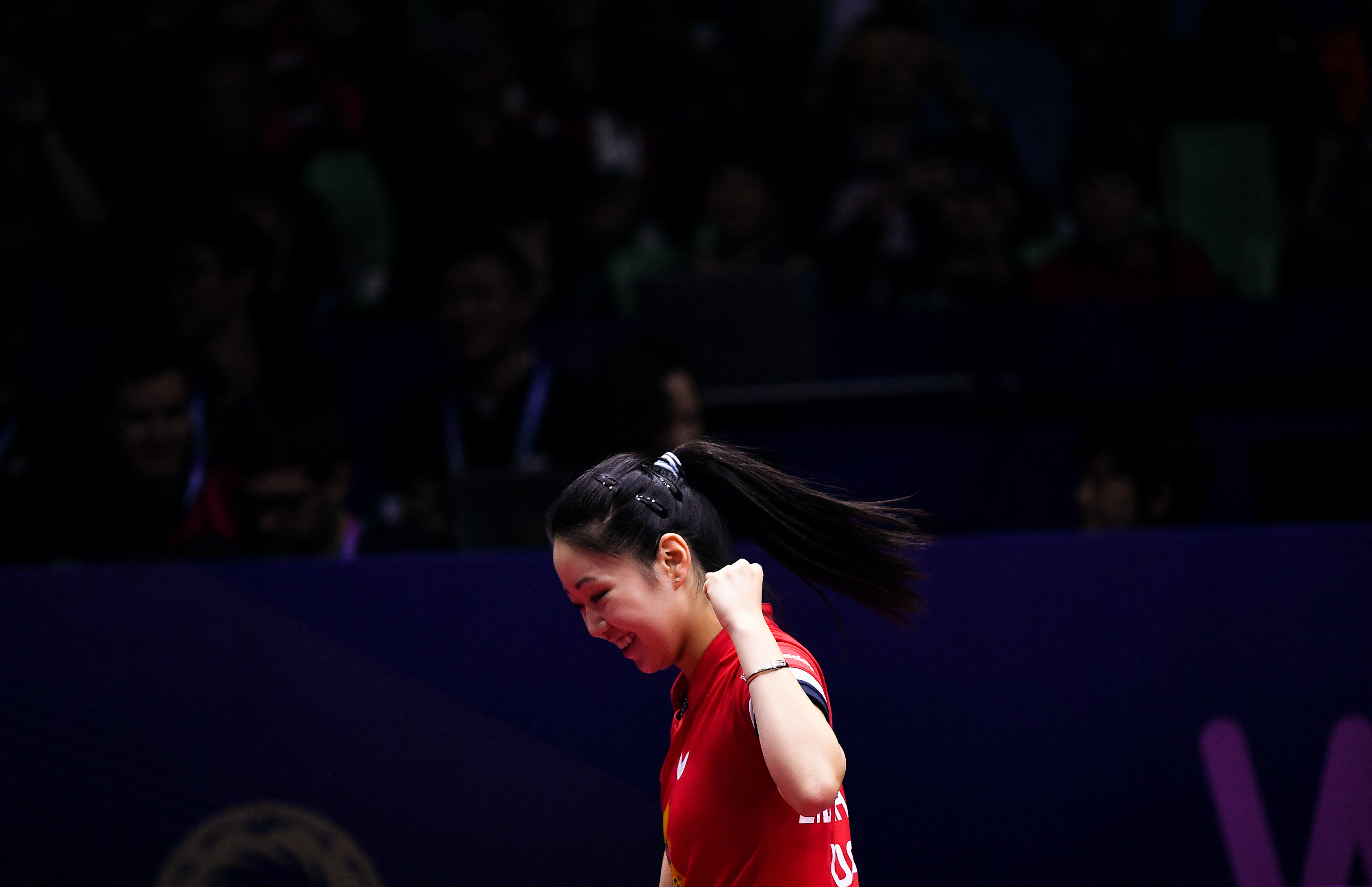Lily Zhang of the United States celebrates after the women's singles round of 16 match against Miu Hirano of Japan at the 2019 ITTF Women's World Cup in Chengdu, southwest China's Sichuan Province, Oct. 19, 2019. (Xinhua/Xue Yubin)