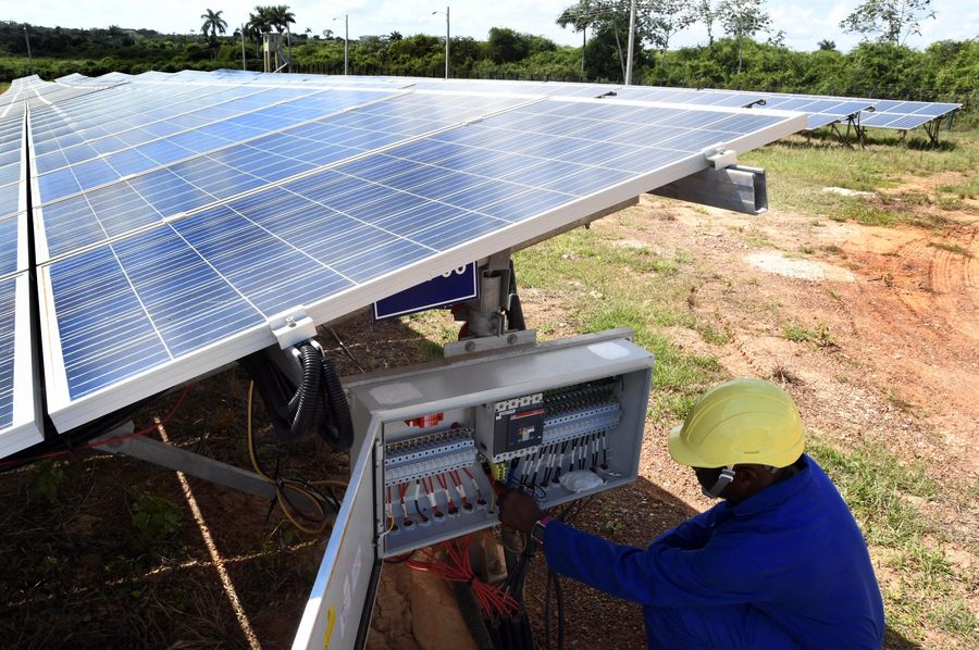 A worker is reviewing the operation of the solar panels of the Pinar 220 A2 photovoltaic solar park, on the outskirts of the city of Pinar del Rio, Cuba, October 15, 2019. (Xinhua/Joaquin Hernandez)