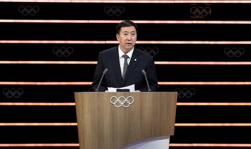 Zhang Jiandong, vice mayor of Beijing, executive vice president of Beijing 2022, makes a report on the activities of Beijing 2022 at the 134th International Olympic Committee (IOC) session in Lausanne, Switzerland, June 25, 2019. (Xinhua/Cao Can)