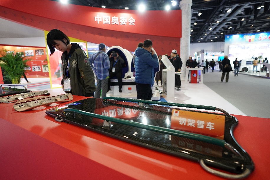 A visitor views the gears for winter sports skeleton at 2019 World Winter Sports (Beijing) Expo in Beijing, capital of China, Oct. 17, 2019. (Xinhua/Ju Huanzong)