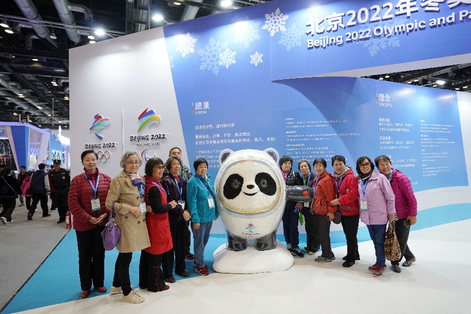 Visitors pose with Bing Dwen Dwen, the mascot of Beijing 2022 Olympic Winter Games at 2019 World Winter Sports (Beijing) Expo in Beijing, capital of China, Oct. 17, 2019. (Xinhua/Ju Huanzong)