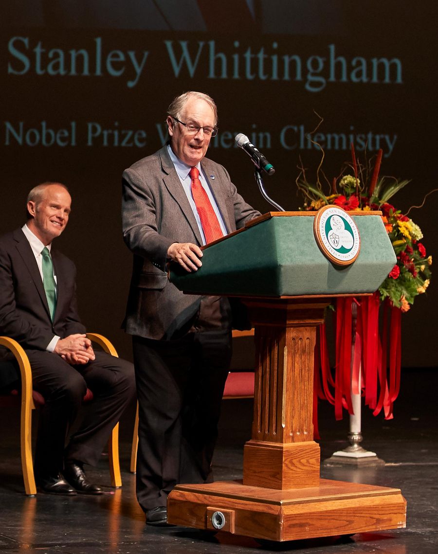 Stanley Whittingham, a 2019 Nobel Laureate in Chemistry, speaks during an event marking the 10th anniversary of SUNY-Binghamton Confucius Institute of Chinese Opera in Binghamton, the United States, on Oct. 18, 2019.(Xinhua)