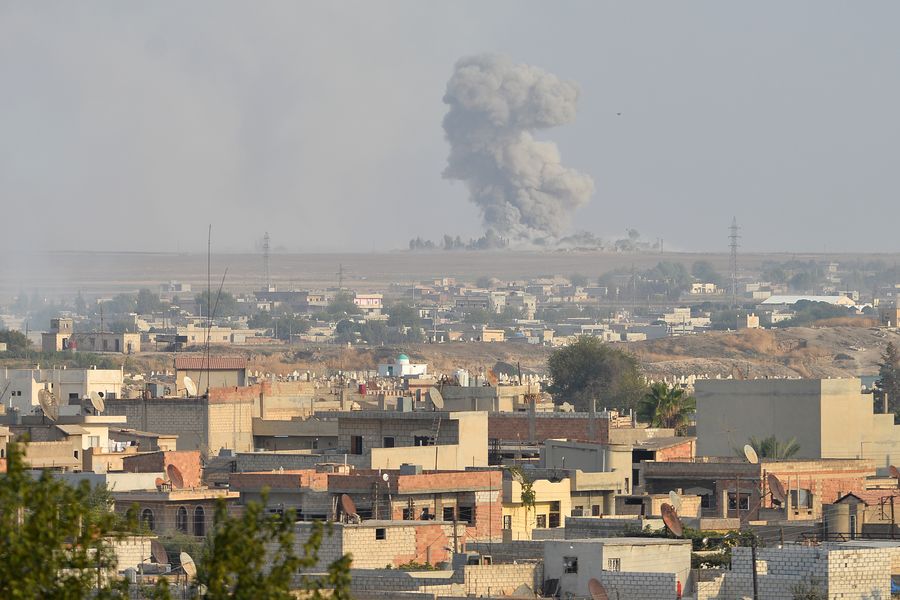 Photo taken on Oct. 9, 2019 shows the northern Syrian city of Ras al-Ain which is under Turkish military attack, as seen from the southern Turkish border town of Ceylanpinar.(Photo by Mustafa Kaya/Xinhua)