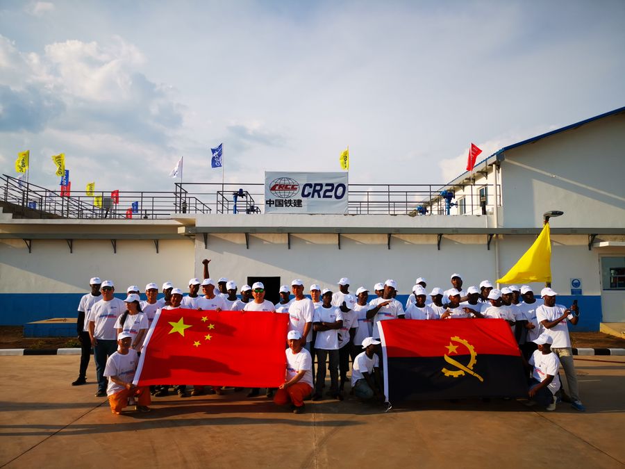 Staffs of China Railway 20th Bureau celebrate the completion of Kuito water supply project in Kuito, Bie province in central Angola, on Oct. 17, 2019. (Xinhua/Qiang Xingxing)