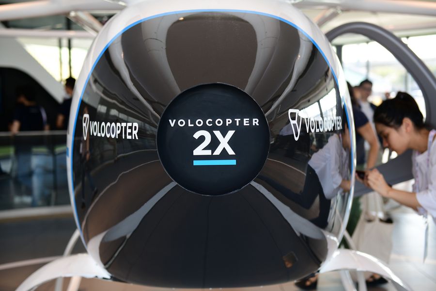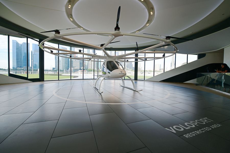 A two-seater Volocopter 2X is on display at the full scale prototype of the world's first air taxi vertiport VoloPort during the Intelligent Transport Systems World Congress at the Marina Bay Floating Platform in Singapore, Oct. 21, 2019. (Xinhua/Then Chih Wey)