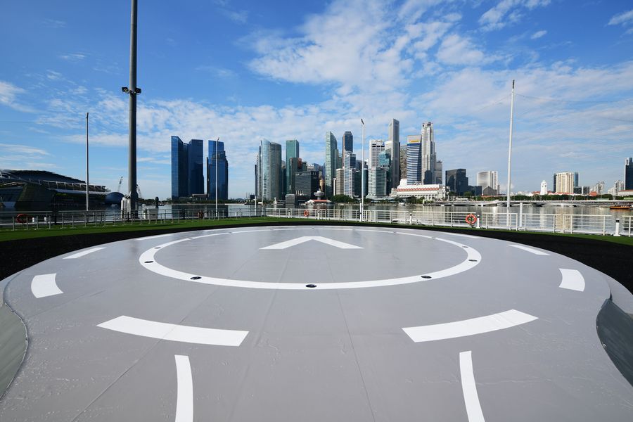 The full scale prototype of the world's first air taxi vertiport VoloPort is on display at the Marina Bay Floating Platform in Singapore, Oct. 21, 2019. (Xinhua/Then Chih Wey)■