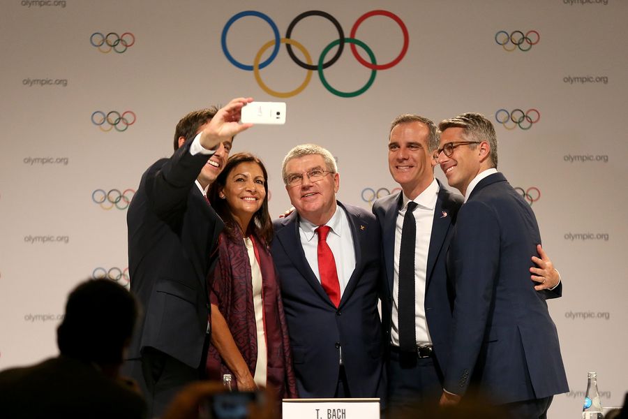 International Olympic Committee President Thomas Bach (C), Anne Hidalgo (2nd L), Mayor of Paris, Tony Estanguet (1st L), Co-chairman of Paris 2024, Eric Garcetti (2nd R), Mayor of Los Angeles, and Casey Wasserman, the chairman of LA 2028 take selfie after a joint press conference at the 131st IOC session in Lima, Peru, on Sept. 13, 2017. The IOC makes historic decision by simultaneously awarding Olympic Games 2024 to Paris and 2028 to Los Angeles on wednesday. (Xinhua/Li Ming)