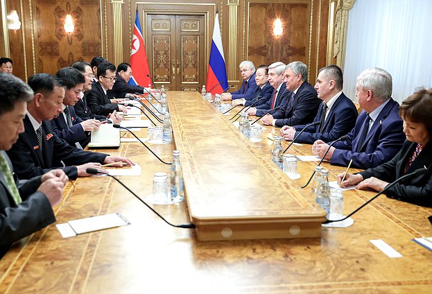Russian State Duma Speaker Vyacheslav Volodin holds talks with Chairman of the Supreme People's Assembly Pak Thae Song in Moscow, Russia on October 22, 2019. (Photo by Russian State Duma)
