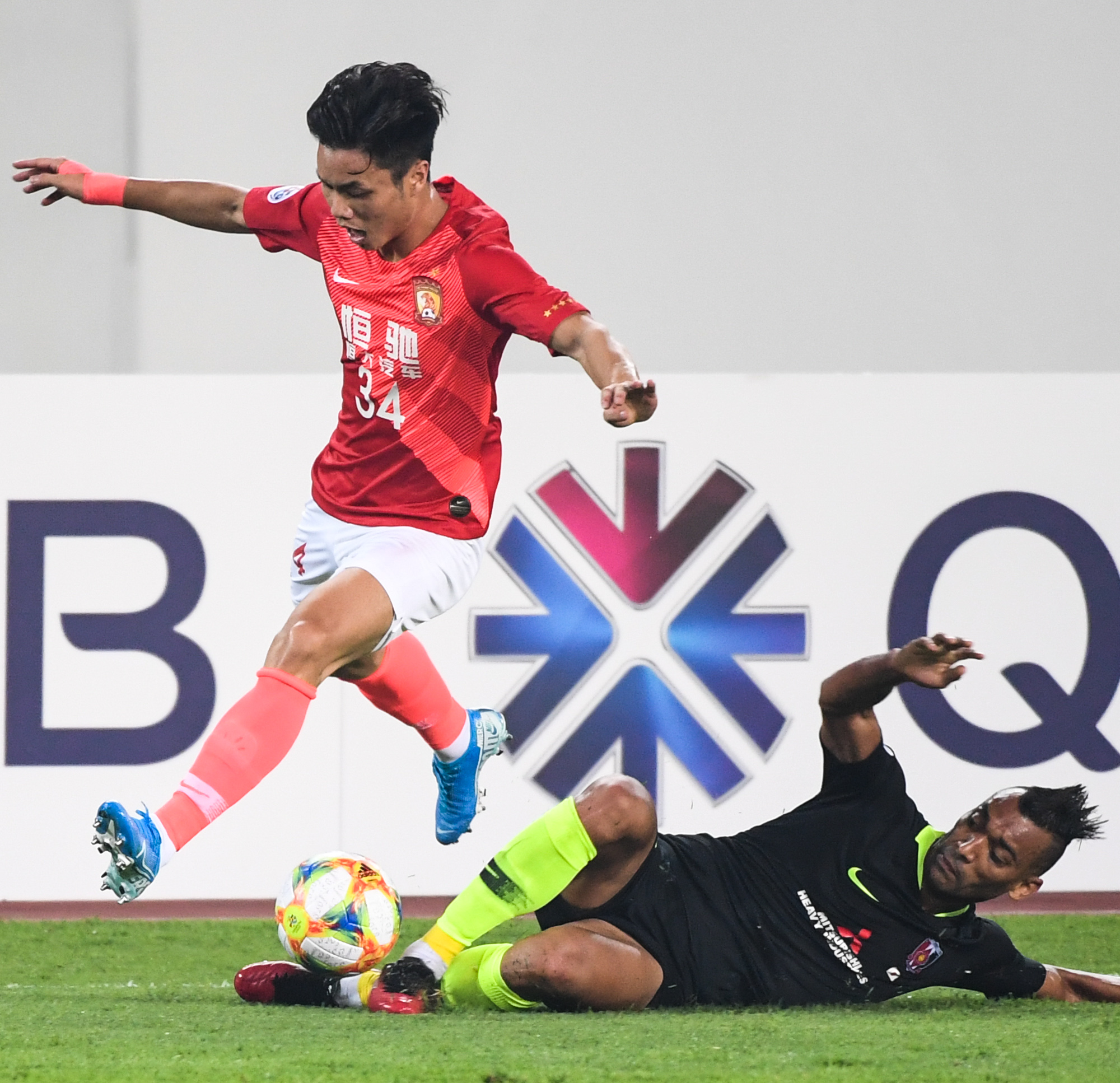 Fabricio (below) of Urawa Red Diamonds competes with Feng Boxuan of Guangzhou Evergrande during the 2nd leg of semi-final match between Guangzhou Evergrande of China and Urawa Red Diamonds of Japan at the AFC Champions League in Guangzhou, capital of south China's Guangdong Province, China, on Oct. 23, 2019. (Xinhua/Deng Hua)