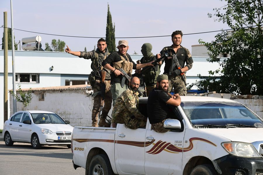Members of Syrian rebel groups allied with Turkey are seen in the Turkish border town of Ceylanpinar, on their way to northern Syrian town of Ras al-Ayn, on Oct. 23, 2019. (Xinhua)