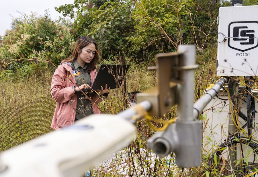 A researcher reads precipitation data of the Yarlung Zangbo Grand Canyon on 22 Oct, 2019 in southwest China's Tibet Autonomous Region. (Xinhua/Sun Fei)
